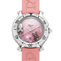 - ハッピーダイヤモンドの大ヒットを受け1993年に発表されたハッピースポーツ。それまでに無かった斬新でキュートなデザインが高い評価を受け、瞬く間に人気シリーズの仲間入りを果たしました。ダイアルの上には2枚のサファイヤガラスが重ねられており、その間を魚のモチーフが流れるように滑ります。ダイアルにもフィッシュ柄をあしらっており、ディテールにこだわりを感じます。