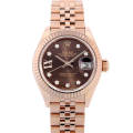 - レディース・ロレックスの定番モデルとも言える「デイトジャスト」。こちらは上品なエバーローズゴールドのモデルです。インデックスにはダイヤモンドがセッティングされており、9時のみゴージャスなローマンインデックスで、その他はダイヤモンドのワンポイントインデックスを留める爪が星型なのもチャーミングです。ムーブメントはパワーリザーブ55時間対応の自動巻きCal.2236を搭載。100m防水。