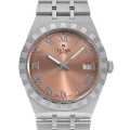 - チューダーの「ロイヤル」シリーズは、スポーティーかつラグジュアリーな時計でありながら、優れたコストパフォーマンスをも発揮しています。一体型の「5列リンク」メタルブレスレットの表面と角の滑らかな質感は、手首に装着したときのフィット感を確かなものにしています。表面のポリッシュと溝の彫りが交互に施されたノッチ入りベゼルが個性的です。2020年発表。