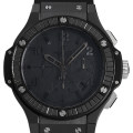 - こちらの“ビッグバン オールブラック”は、その名に偽り無く、全てをブラックで統一したモデルです。針やカレンダーまでブラックにしたため視認性は多少犠牲になりましたが、これにより一層美しさが際立ちました。ベゼルにはブラックバゲットダイヤ(2.80ct)を豪華にセッティングしています。