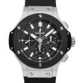 - 2005年にフュージョン(融合)をコンセプトに誕生したビッグバン。こちらはステンレススティールケースに、ブラックセラミック製ベゼル、マットカーボンダイアルを組み合わせたクールなデザインとなっています。ケースバックはスケルトンになっているため、搭載している自動巻きHUB4100の巻き上げローターやムーブメントの動きを楽しめます。