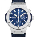 - バーゼルワールド2017にて発表された「ビッグバン スティール ブルー」は鮮やかなブルーダイヤルが上品な清涼感を放つ1本です。ストラップにはウブロならではのブルーラバーxブルーレザーを採用。汗ジミに強く、装着感に優れています。ムーブメントには自動巻きクロノグラフHUB4100を搭載。パワーリザーブ42時間、防水性100m。
