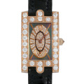 - ダイヤを贅沢に敷き詰めた18金ローズゴールドケースは、「キング・オブ・ダイヤモンド」と呼ばれ世界的に名高いハリーウィンストンを象徴するデザインです。ケースの上下にあしらわれたアーチ形のラグは、ニューヨーク5番街にあるハリーウィンストン本店の玄関ドアをモチーフにデザインされました。オーバル型のデザインを取り入れた文字盤が特徴で、女性的でエレガントな美しさを醸し出しています。