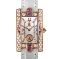 - ダイヤを贅沢に敷き詰めた18金ローズゴールドケースは、「キング・オブ・ダイヤモンド」と呼ばれ世界的に名高いハリーウィンストンを象徴するデザインです。ケースの上下にあしらわれたアーチ形のラグは、ニューヨーク5番街にあるハリーウィンストン本店の玄関ドアをモチーフにデザインされました。さらに、各所にピンクサファイヤが使用され、より高級感をかもし出しています。
