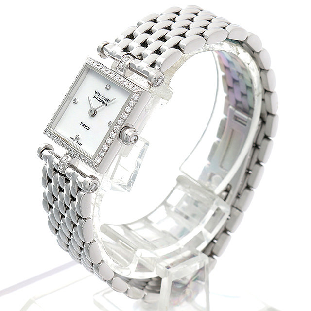 - “モナコ王室御用達ブランド”であることでも有名な“ヴァンクリーフ&アーペル”。シンプルな2針モデルですが、光沢のあるホワイトシェルダイヤル、ベゼルに取り巻かれたダイヤ、金無垢製ホワイトゴールドケースのコンビネーションが抜群の存在感を放っています。
