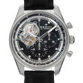 - エル・プリメロが誕生した1969年当時のデザインと、テンプの動きが正面から見える人気のオープンを組み合わせたモデルです。メンズとしては標準的なサイズで扱いやすい42mm径。サンレイ仕上げのブラックダイアルに、ブラックのインダイアルの組み合わせが、クールな印象のあるデザインです。