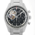 - 1969年発表の初代エルプリメロをイメージした「クロノマスター 1969」。こちらは2017年のバーゼルワールドで発表されたモデルです。メインダイヤル、インダイヤルにブラックを配色した立体感が特徴的。ゼニスならではのオープン窓、そしてシースルーバックから名機エルプリメロ4061をご鑑賞いただけます。パワーリザーブ約50時間、10気圧防水。