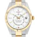 - バーゼルワールドで発表され話題になった高機能モデルスカイドゥエラーです。GMTマスターとは異なりディスクが回転することで赤い逆三角形のマーカーから第二時間帯を読み取ります。また「サロス」と名付けられた年次カレンダー。文字盤外周の小窓で月を表し、3時の小窓で日付を表示。実用性と機能美を兼ね備え、ロレックスの革新性を感じさせるコンプリケーションモデルとなっております。