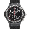 - 時計全体をブラックカラーで統一されたモデルでブラックPVD加工が施されたステンレス製のベゼルには114ピースのウブロ純正ダイヤモンドがセッティングされています。ラミック製のケースに100m防水。
