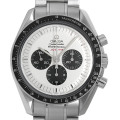 - 2004年にアポロ11号月面着陸35周年を記念して3500本限定で販売されたモデルです。スピードマスターでは珍しいシルバー文字盤にブラックのインダイヤルという組み合わせが目を惹きます。文字盤に赤字で「July20.1969」と人類が初めて月に降り立った日をプリントしています。裏蓋にはアポロ11号のミッションバッチである月面に舞い降りたイーグルを配しており、ファンには溜まらない仕様となっています。