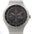 - 「ポルシェデザイン」と「IWC」という豪華な組み合わせが作り出した共同開発モデル。発売当時、大変話題になった近未来的デザインは今見てもまったく色あせません。素材にはチタンを使用しているため驚くほど軽く、秒・分・時のクロノグラフやタキメーターを備えているため、機能性も抜群です。隠れた名作を生み出し続けた時計メーカーの、独特な雰囲気を醸し出す個性的な一本を是非ご堪能下さい。また、こちらは筆記体のロゴに、文字盤にポルシェデザインの文字が入っていない最初期のレアモデルです。