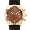 - フランス軍の航空部隊用として開発された“タイプXX”を現代風にアレンジした“トランスアトランティック”。ケースサイドにはブレゲの伝統を物語るコインエッジを採用し、調和の取れたスタイリッシュなデザインに仕上がっています。イエローゴールドケースにブラウンダイアルの組み合わせが、ヴィンテージの風合いを感じさせる大人のクロノグラフモデルです。
