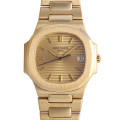 - 30年以上前にパテックフィリップ初の本格スポーツウォッチとして誕生したノーチラス。オリジナリティあふれるオクタゴン型(八角形)のフォルムは、各辺が緩やかなカーブを描き全体が洗練されたクラシックな形をつくり出しています。こちらは既に生産終了したイエローゴールドモデルです。サイズはボーイズサイズで、ムーブメントはクォーツ。年々入手が困難になってきており、希少性が高まっています。