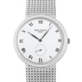 - ヴィクトリア女王やアインシュタインをはじめ、世界中の名士・著名人に愛されたパテックフィリップ。こちらのRef.3919/5Gはホワイトゴールド製メッシュブレスを備えたラグジュアリーなモデルです。クラシカルな“クル・ド・パリ”ベゼルがパテックフィリップらしい上品な印象を与えています。一味違うパテックをお探しの方にお勧めしたい逸品です。