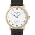 - パテックフィリップ永遠の定番“カラトラバ"。その完璧なプロポーションは丸型ウォッチの規範とされ、その後の時計界に多大な影響を与えました。鋲打ち模様と言われるホブネイルパターンのベゼルが、クラシカルでありながら高級感あるデザインです。