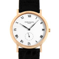 - 発売から約十年間に渡りパテックの顔として広告イメージにも採用され、惜しまれながらも2006年頃に製造が終了したモデルです。発売当時は海外で絶大な人気を誇ったモデルですが、生産が終了した現在では日本での人気も高まってきております。鋲打ち模様と言われるホブネイルパターンのベゼルが、クラシカルでありながら高級感あるデザインです。ムーブメントは1976年に登場して以来、多くの手巻式に採用されてきた信頼性の高いCal.215を採用しています。柔らかな色合いのローズゴールドは、日本人の肌の色に最も良く似合う素材です。 ※こちらは、ジョイント式リューズを使用したモデルになります。リューズを強く引っ張ると抜けてしまう事がございますが、構造上の特性によるもので、故障ではございません。