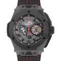 - 2013年のバーゼル・ワールドで発表された大人気モデル「ビッグバン」。こちらはフェラーリとのコラボレーションモデルで、車のホイールからインスピレーションを受けたローター、文字盤9時位置にはフェラーリ社の「跳ね馬」エンブレム。ベルトステッチにはフェラーリのコーポレートカラーであるレッドが使われるなど、フェラーリファンには堪らないデザインです。1000本限定。ブラックセラミックケースにウニコ(Cal.HUB1241)を搭載。72時間のパワーリザーブに対応しています。