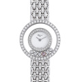 - デザイナーが散策中に、滝からほとばしる水滴が太陽の光を受けて美しく輝く様子を見て思いついたといわれる“ハッピーダイヤモンド”。2重サファイアクリスタルの間を動きまわる6つのムービングダイヤでたくみに表現しています。ベゼルに取り巻かれたダイヤと金無垢製ホワイトゴールドケースは存在感抜群で、目を惹くこと間違い無しです。