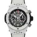 - 自社製フライバッククロノグラフムーブメント「ウニコ」を搭載したビッグバンです。こちらはホワイトセラミックを採用した爽やかでスポーティーでありながらも上品なデザインです。スケルトンの文字盤からその精巧な動きをご覧いただけます。