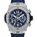 - 軽量で強靭な素材チタンを使用した"ビッグバン ウニコ チタニウム"の2018年発表モデルです。ブルーをメインカラーとしており、ブルースケルトン文字盤にブルーベルトを備え、爽やかで統一感のある仕上がりです。裏蓋もシースルーバックになっており、72時間パワーリザーブを誇る自社製ムーブメントウニコ(Cal.HUB1242)の動きを裏と表の両面から楽しむことができます。
