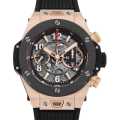 - 2005年にフュージョン(融合)をコンセプトに誕生したビッグバン。こちらのケースに用いられているキングゴールドは、レッドゴールドに約5%のプラチナを配合し、時間経過による色の変化を抑えたウブロ独自の素材です。ブラックセラミックのベゼルを組み合わせたゴージャスな仕上がりです。ムーブメントにはウニコ(HUB1242)自動巻きクロノグラフを搭載。フライバックムーブメント+コラムホイール、パワーリザーブは約70時間です。バーゼルワールド2013で発表されたモデルです。