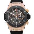 - 2005年にフュージョン(融合)をコンセプトに誕生したビッグバン。こちらのケースに用いられているキングゴールドは、レッドゴールドに約5%のプラチナを配合し、時間経過による色の変化を抑えたウブロ独自の素材です。ブラックセラミックのベゼルを組み合わせたゴージャスな仕上がりです。ムーブメントにはウニコ(HUB1242)自動巻きクロノグラフを搭載。フライバックムーブメント+コラムホイール、パワーリザーブは約70時間です。バーゼルワールド2013で発表されたモデルです。