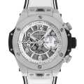 - 自社開発ムーブメント“ウニコ”を搭載したビッグバンのモデルです。ダブルクラッチ、ダイアル側から眺めることができるコラムホイール、72時間パワーリザーブを備えた前モデルのユニークな構造はそのまま受け継いでいます。背面がシースルー仕様になっているため、キャリバーを表側からも裏側からも楽しむことができます。サテンとポリッシュ加工が施されたチタニウムケースは、非常に軽量であり、傷がつきにくい点も特徴です。100m防水。