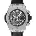 - チタンケースとスケルトン文字盤のコンビネーションが美しいビッグバンを入荷致しました。表裏共にスケルトン仕様となっておりますので、完全自社製の新型ムーブメントウニコ(Cal.HUB1280)の動きを堪能することができます。柔軟性の高いラバーストラップを採用し、アグレッシブにお使い頂ける一本に仕上がっています。2021年発表モデル。