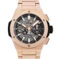 - 自社開発・製造によるムーブメント「ウニコ(UNICO)」の薄型モデルCal.1280を搭載し、72時間のパワーリザーブを実現。高性能と信頼性を誇るウブロの技術力が結晶した一本です。標準的なブレスレットでありながら、ケースの仕様を踏襲したシャープなスタイルが印象的。プッシャーは美しいエッジを重ねるだけでなく、中央の構造までカットアウトされた緻密な仕上がりです。ポリッシュとサテンのコントラストに加え、傾斜と面取りが巧みにリンクし、ケースとベゼルラグの間に深みと陰影をもたらします。ケース自体も再設計されており、細部まで抜かりのない完成度を誇ります。キングゴールドのラグジュアリーで存在感のある仕上がりは、周囲の視線を惹きつけてやまないモデルです。