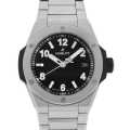 - ケースとブレスレットが一体化した本モデルは、そのデザインコンセプトがモデル名にも反映されており、チタニウム製のケースにブラックダイアルが精悍な印象を与えます。力強いケースには"ビッグバン"の象徴とも言える「耳」があしらわれ、6つのH型ビスを配したベゼルやスケルトン仕様の大型時分針、そしてカウンターポイズ仕上げの秒針が、マニュファクチュールとしてのこだわりを物語ります。偶数インデックスやラバーで覆われたリューズなど、"ビッグバン"コレクションに共通する美学的要素は全てこのモデルに継承されています。ウブロが1980年代に飛躍を遂げた当時のスタンダードとされていた38mmサイズに回帰。より洗練されたプロポーションを実現しています。