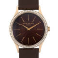 - パテックフィリップ永遠の定番カラトラバ。無駄の無い輪郭、端正な表情、滑らかな素材感などシンプルな洗練さを追求したこだわりが表現されいてる超薄型ウォッチです。こちらは文字盤にサンレイパターンを表現するギョーシェ加工を施し、ベゼルにダイヤモンドをセッティングした上品なモデルです。