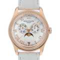 - ローズゴールドケースにマザーオブパール文字盤、ベゼルとリューズに贅沢にあしらわれたダイヤモンドが輝く華やかなモデルです。ムーブメントには自動巻きキャリバーを搭載しており、アニュアルカレンダーとムーンフェイズを備えています。