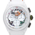 - 2022年発表モデル、高振動1/100秒精度のエル・プリメロ21 クロノグラフを搭載したデファイ 21 クロマが入荷しました。カラフルなラームーブメントピースとレインボーカラーグラデーションのマーカーを配されたスケルトンダイアルと44mmマットホワイトセラミック製のケースのコンビネーションは大変スタイリッシュな雰囲気を与えています。パワーリザーブ約50時間。世界限定200本モデル。