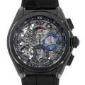 - 「エルプリメロ9004」を搭載した"デファイ エル・プリメロ 21"です。1秒で1回転するセンターのクロノ針は、ダイアル外周に1/100秒を計測可能なスケールを備えています。最大の特徴はゼンマイの巻上げ方法で、リューズを反時計回りに回すことで通常のゼンマイの巻上げを行います。また、リューズを時計周りに回すとクロノグラフのゼンマイを巻き上げを行い、残量を12時位置のインジケーターで表示します。パワーリザーブ50時間、10気圧防水。