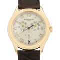 - 搭載している年次カレンダーは毎年3月1日に日付修正をするだけで、あとは日付を修正する必要がありません。3時位置に月、6時位置に24時間表示と日付、9時位置に曜日表示を備え、ケースサイドのプッシュボタンを押すことで簡単に操作できます。