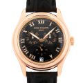 - ローズゴールドケースに S QA 24Hを搭載したコンプリケーションウォッチです。搭載している年次カレンダーは毎年3月1日に日付修正をするだけで、あとは日付を修正する必要がありません。3時位置に月、6時位置に24時間表示と日付、9時位置に曜日表示を備え、ケースサイドのプッシュボタンを押すことで簡単に操作できます。