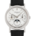 - パテックの永久カレンダーRef.5039。3時位置のインダイヤルに月と閏年を表示、6時位置にはデイトとムーンフェイズ、9時位置には曜日と24時間計を備えます。ムーブメントには超薄型自動巻Cal.240Qを搭載。スリムなケース厚を実現しています。生産終了モデルです。