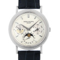 - パテックの永久カレンダーRef.5039。3時位置のインダイヤルに月と閏年を表示、6時位置にはデイトとムーンフェイズ、9時位置には曜日と24時間計を備えます。スリムなケース厚を実現しています。生産終了モデルです。