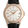 - 2005年に生産終了となったカラトラバ5107ローズゴールドケースです。リューズガードの形状が特徴的なモデルで、通常のカラトラバシリーズには余り採用されていなかったねじ込み式リューズを有しているところも、他のモデルから一線を画した近代設計といえるでしょう。キャリバーはカレンダー付センターセコンドの315SCを搭載し、その可動をスケルトンバックからご覧いただけるのも魅力の一つです。