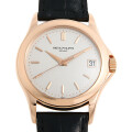 - 2005年に生産終了となった“カラトラバ5107”ローズゴールドケースです。リューズガードの形状が特徴的なモデルで、通常のカラトラバシリーズにはあまり採用されていなかったねじ込み式リューズを有しているところも、他のモデルから一線を画した近代設計と言えるでしょう。キャリバーはカレンダー付きセンターセコンドの315SCを搭載し、その可動をスケルトンバックからご覧頂けるのも魅力の一つです。