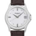 - パテックフィリップ永遠の定番カラトラバ。その完璧なプロポーションは丸型ウォッチの規範とされ、その後の時計界に多大な影響を与えました。こちらはホワイトダイアルに、8ポイントのラウンドダイヤモンドと3ポイントのバケットダイヤモンドのインデックスをセッティングし、さらにベゼルに52個のダイヤモンドを配したゴージャスなモデルです。
