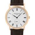 - パテックフィリップ永遠の定番人気である“カラトラバ"。その完璧なプロポーションは丸型ウォッチの規範とされ、その後の時計界に多大な影響を与えました。こちらはローズゴールドのケースに、パリの石畳をモチーフにしたピラミッド状の格子模様のギョーシェ装飾が特徴的なクルー・ド・パリ・ベゼルが目を引くモデルです。クルー・ド・パリ・ベゼルは1990年代にパテックフィリップの広告媒体に多用されたことにより、このデザインが定着しました。また必要最低限の機能をシンプルな文字盤上に表現するという原則があるカラトラバコレクション、最もパテックらしさを表している1本です。