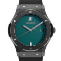 - ウブロが掲げるフュージョン・コンセプトとクラシックシリーズが融合して生まれたクラシックフュージョン。こちらはブリティッシュグリーンと呼ばれる青みがかった特徴的な色調のダイアルに、サテンとポリッシュで仕上げられたブラックセラミックをケース&ベゼルに用いられており、エレガントな雰囲気を放っています。