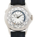 - 世界を飛び回る旅行者のために製作された時計「ワールドタイム」。こちらのモデルはホワイトゴールド製のケースです。文字盤には世界24都市の名前が刻まれており、10時位置のプッシュボタンで各都市の時間を設定することが可能です。また、初代モデルはケースサイズ37mmでしたが、こちらのモデルは39.5mmとなっております。キャリバーは240HU。3気圧防水対応。