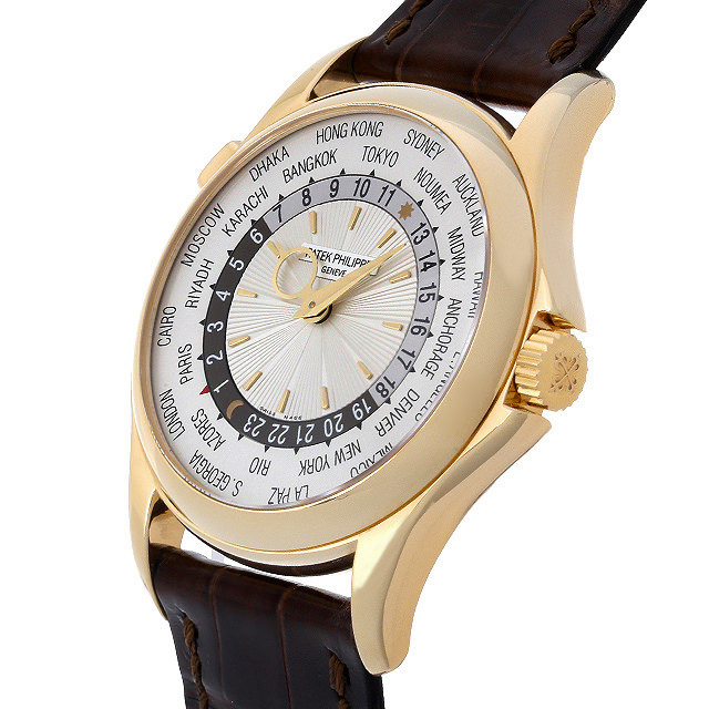 - 世界を飛び回る旅行者のために製作された時計“ワールドタイム”。10時位置のプッシュボタンを押すだけで文字盤上の都市名外周リング、24時間表示の内周リング、ローカルタイムを示す時分針が操作され、ローカルタイムと世界24都市の時間を同時に表示することが出来ます。ムーブメントには22金マイクロローターを採用し、高い巻上げ効率を誇る自動巻きCal.240HUを搭載。1つ前のモデルRef.5110は36mmケースでしたが、今回は39.5mmとなりダイヤルに彫られたギョーシェにも違いがございます。