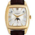 - 年次カレンダー・24時間表示・ムーンフェイズ搭載の「ゴンドーロ・カレンダリオ」。パテックにしては大ぶりなトノーケースに自動巻きCal.324 S QA LU 24 Hを搭載したモデルです。すでに定評のある5036/1モデルと同様、年次カレンダー機構はレバーを用いず、ほとんど歯車だけによって実現されているという大きな特徴を持っています。