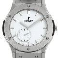- クラシックシリーズ最大の45mmケースに、厚さわずか2.9mmの自社開発ムーブメントHUB1300を搭載したモデルです。ウブロとしては珍しく手巻きムーブメントを採用しており、ケースバックからその精巧な動きをご覧頂けます。ケースにはチタン採用し、ラッカーホワイトの文字盤とブラウンのレザーベルトと相まって上品な印象を与えます。