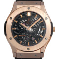 - クラシックシリーズ最大の45mmケースに、厚さわずか2.9mmの自社開発ムーブメントを搭載したスケルトンモデルです。ウブロとしては珍しく手巻きムーブメントを採用しており、そのメカニカルな部分を強調しています。ピンクゴールドの輝きが美しい500本限定モデルです。