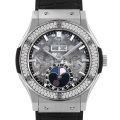 - 人気の高いクラシックフュージョンのアエロモデル“アエロフュージョン”です。文字盤には透明度の高いサファイアガラスを使用し、精巧なムーブメントの動きをじっくりとご堪能いただけます。実用性の高いトリプルカレンダー、ムーンフェイズを備えており、合計126個のダイヤモンドをセットしたゴージャスなベゼルが印象的なモデルです。ムーブメントは自動巻きHUB1131搭載。パワーリザーブ42時間。