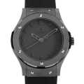 - 革新的なデザイン哲学「フュージョン(融合)」。ケースを構成する各パーツを細分化し、それぞれにセラミック、チタン、カーボン、貴金属といった異素材を組み合わせることで、伝統と革新を共存させるという挑戦です。この理念を、ウブロが創業当初から大切にしてきた"クラシック"コレクションに落とし込んだのが"クラシックフュージョン"。その中でも一際独自の存在感を放つのが、こちらの"オールブラック"モデルです。「Invisible Visibility(見えない可視性)」というコンセプトを体現する本モデルは、ダイアルからケース、ストラップに至るまで、深いブラックに統一されたミニマルな佇まいが魅力。カラーを排したことでむしろ浮かび上がる造形美と素材感が、確かな存在感を主張します。